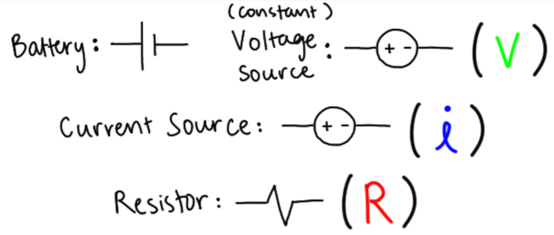 Image showing the schematic symbols for batteries, constant voltage sources, constant current sources, and resistors.