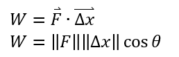 A dot product is the magnitude of a vector (a scalar quantity) multiplied by the magnitude of another vector projected onto the first vector (another scalar quantity), which produces a scalar quantity, which, in our case, is the same as the magnitude of the displacement vector times the magnitude of the force vector multiplied by the cosine of the angle between the two vectors.