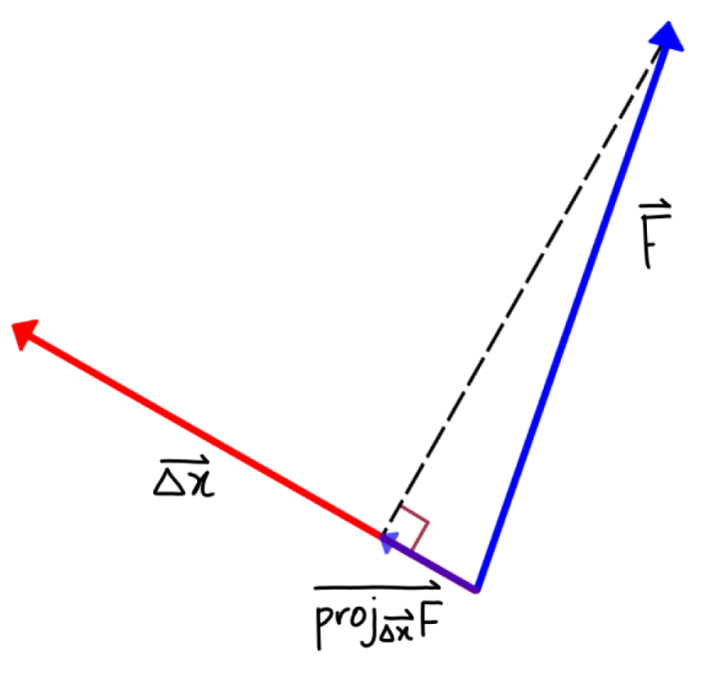 For our purposes, we achieve this “projection” by multiplying our force vector by the cosine of the angle between our force vector and our displacement vector. This gives us the force vector projected onto the displacement vector, or the component of the force vector that is parallel to the displacement vector. So: