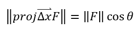 So, with these concepts in mind, here is the final proof that our two definitions of work are equivalent (F ⋅ Δx = ||F||||Δx||cos(θ)), using the diagram below: